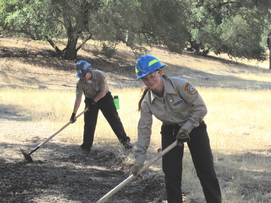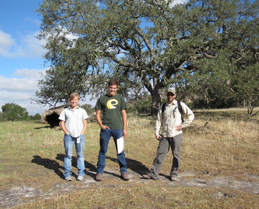 Cal Poly trail interns Rachel McDowell (Animal Science) and Casey Dilg (Biology) are shown with Daniel Bohlman, Stewardship Manager for The Land Conservancy of SLO County, working on preparations for the October start of trail days for Santa Margarita's 4th-6th grade students. |